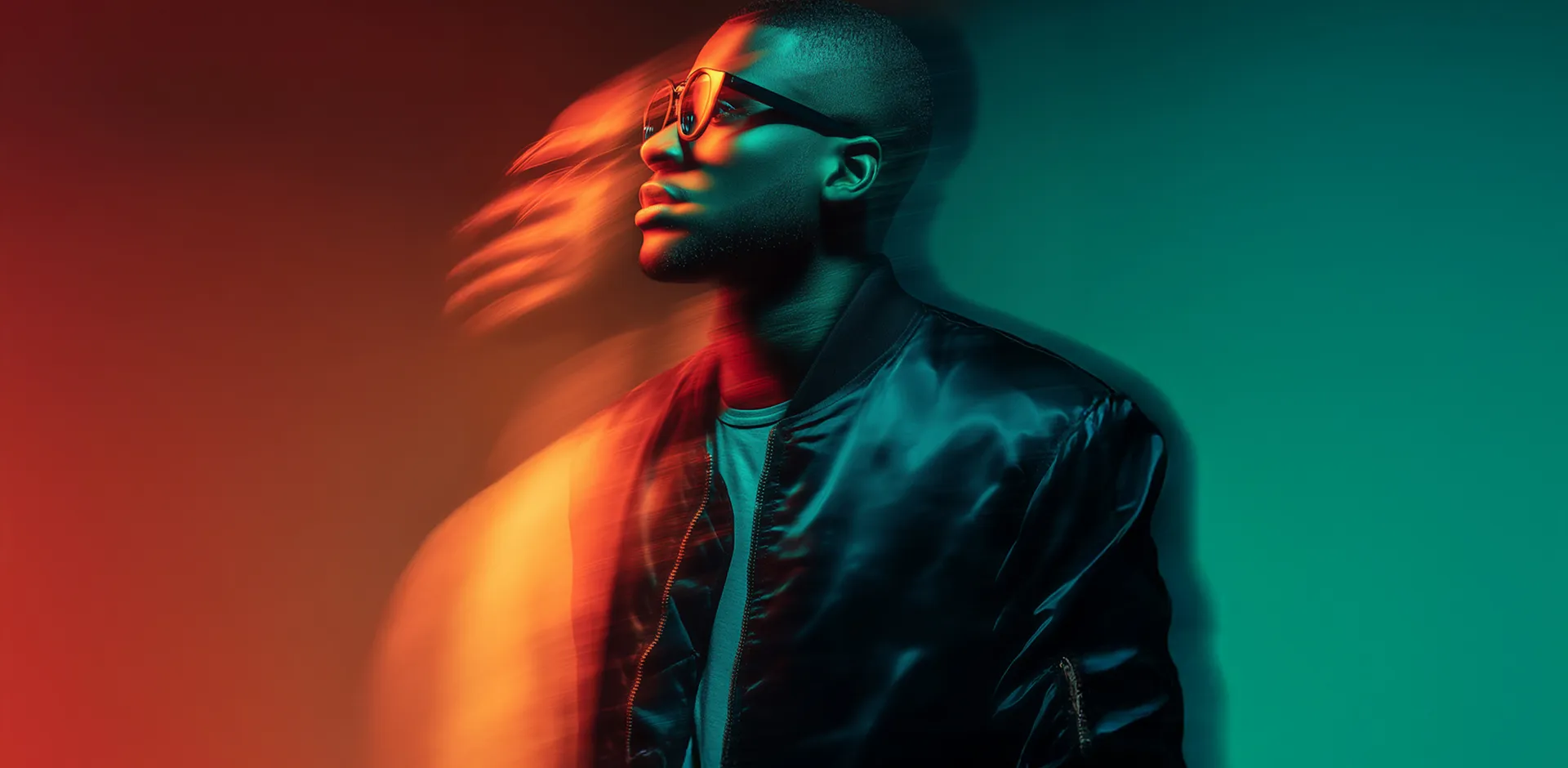 Portrait of a man in an orange patterned shirt and orange-tinted sunglasses with blurred motion effect on hair and shirt against a gray background.